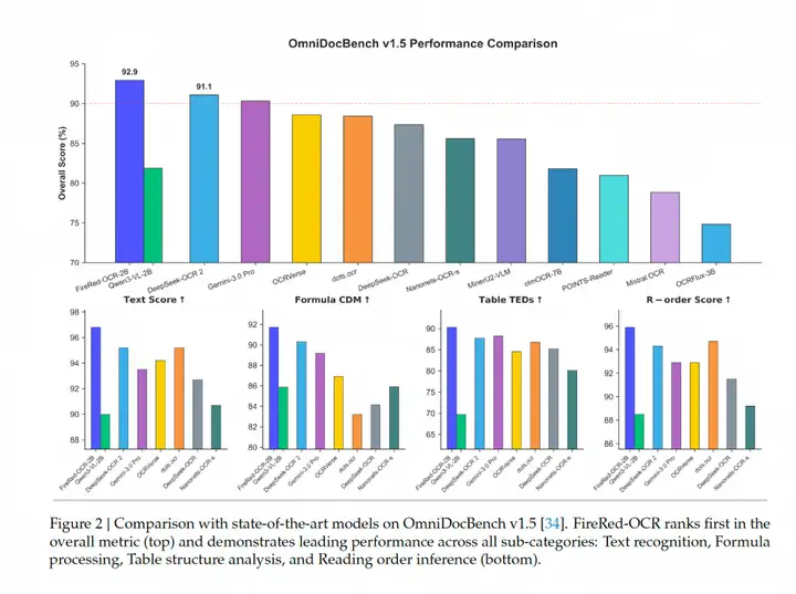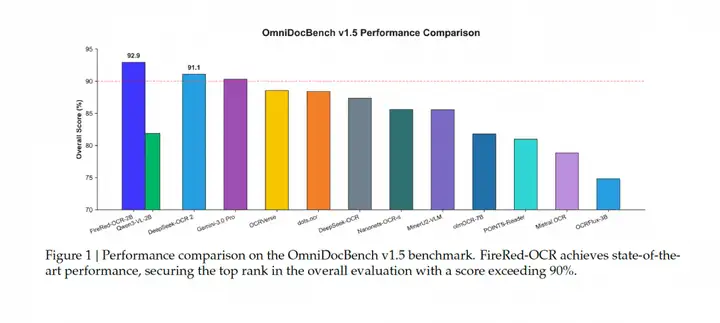 来自小红书超级智能团队的 FireRed-OCR,以仅 20 亿参数的轻量模型,在权威文档解析基准 OmniDocBench v1.5 上拿下端到端方案第一,综合得分 92.94%,超越 Gemini 3.0 Pro、DeepSeek-OCR 2 和 Qwen3-VL-235B。