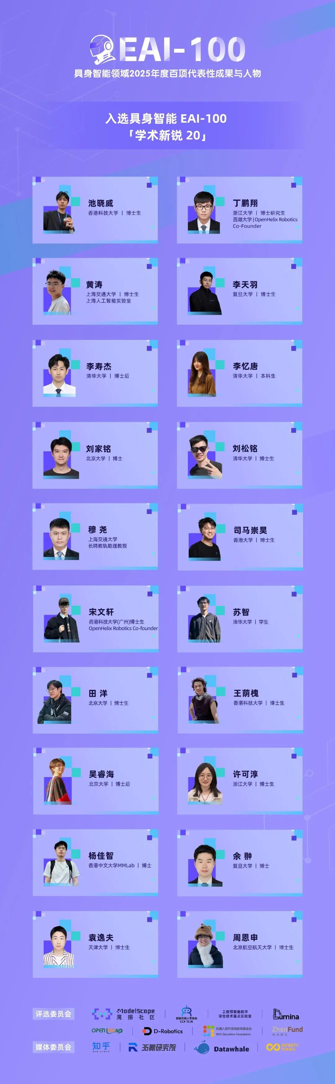 聚焦平均年龄不到28岁的青年学者。他们作为顶会论文的第一作者和开源社区的核心力量,代表着具身智能不可限量的明天。