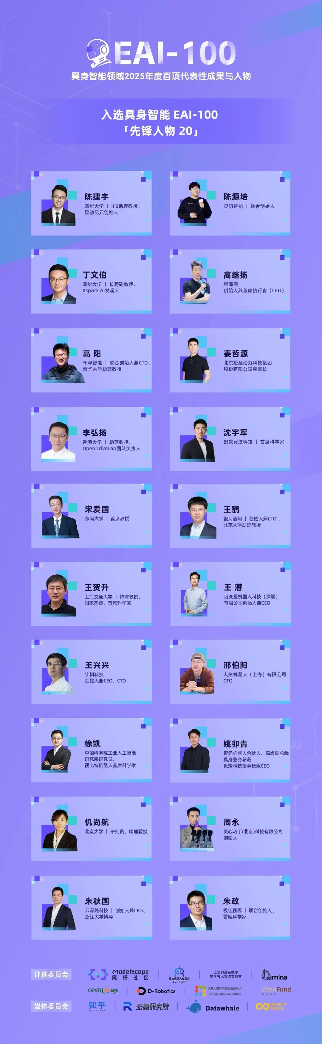 汇聚了20位在理论、技术、应用与生态全方位发挥“开路者”作用的顶尖学者、硬核创业者与科技巨头领军人。他们是具身智能中国坐标的刻画者。